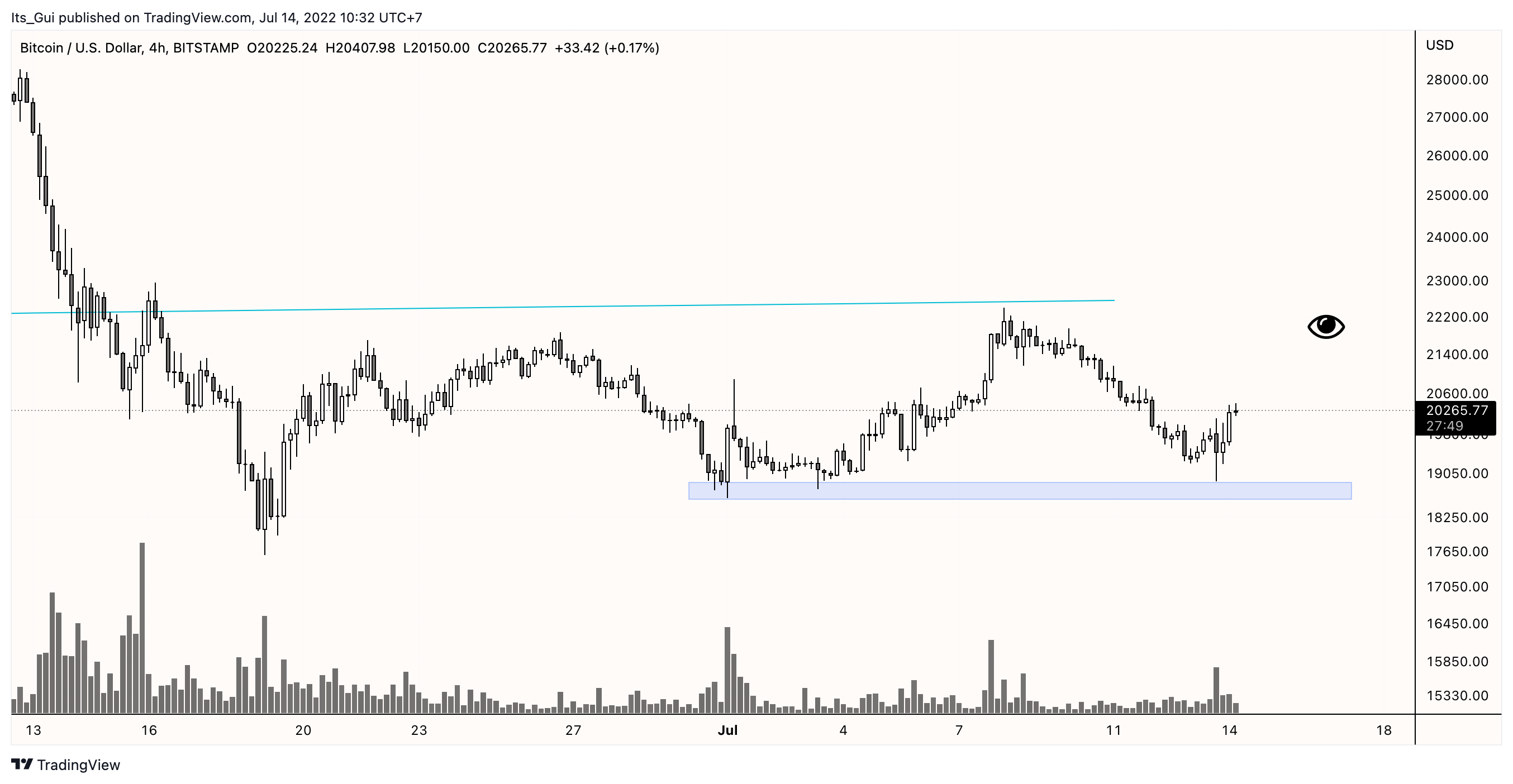 Previous support at $19,000 got tested last night during the CPI release, tagged it and reversed sharply to the upside. A thing of beauty. As long as $19,000 holds, my interest lies in revisiting the higher part of the range. $22,222 is the number.